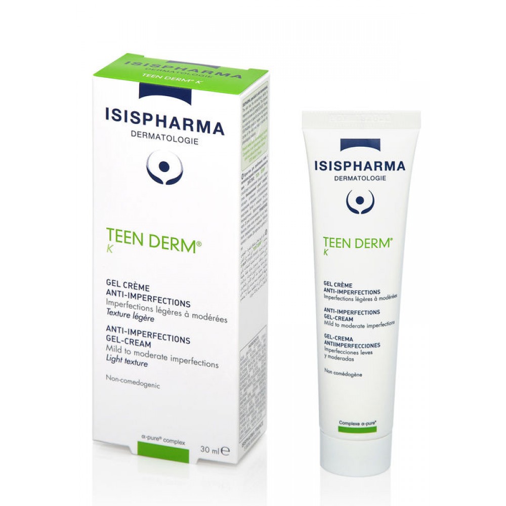 TEEN DERM K, гель-крем для проблемной коди с легкой и средней степенью выраженности акне, помогает устранить пятна и угри. Инновационный комплекс ?-PURE® обогащен себорегулирующими, вяжущими, очищающими и успокаивающими активными ингредиентами. Несовершенства заметно сокращаются. Чистая и свежая кожа. Легкая и нежирная текстура для матовой кожи.