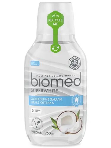 [description] => Натуральный комплексный ополаскиватель Biomed Superwhite с кокосовым вкусом и ароматом бережно осветляет эмаль, усиливает отбеливающие свойства зубной пасты. На 99% состоит из компонентов натурального происхождения. Ферментированный экстракт кокоса и фермент папаин растворяют налет. L-аргинин, цинк, медь и магний укрепляют эмаль, экстракты подорожника и листьев березы оказывают антикариесное и противовоспалительное действие. Ополаскиватель рекомендован взрослым и детям от 6 лет (под контролем родителей).
