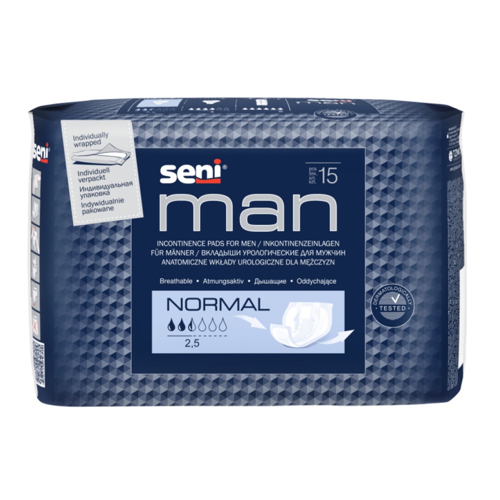 [description] => Seni Man Normal созданы специально для мужчин, которые ведут активный образ жизни, ценят комфорт и безопасность. «Дышащие» урологические вкладыши Seni Man Normal оптимально адаптируются к форме тела, благодаря чему незаметны под одеждой.