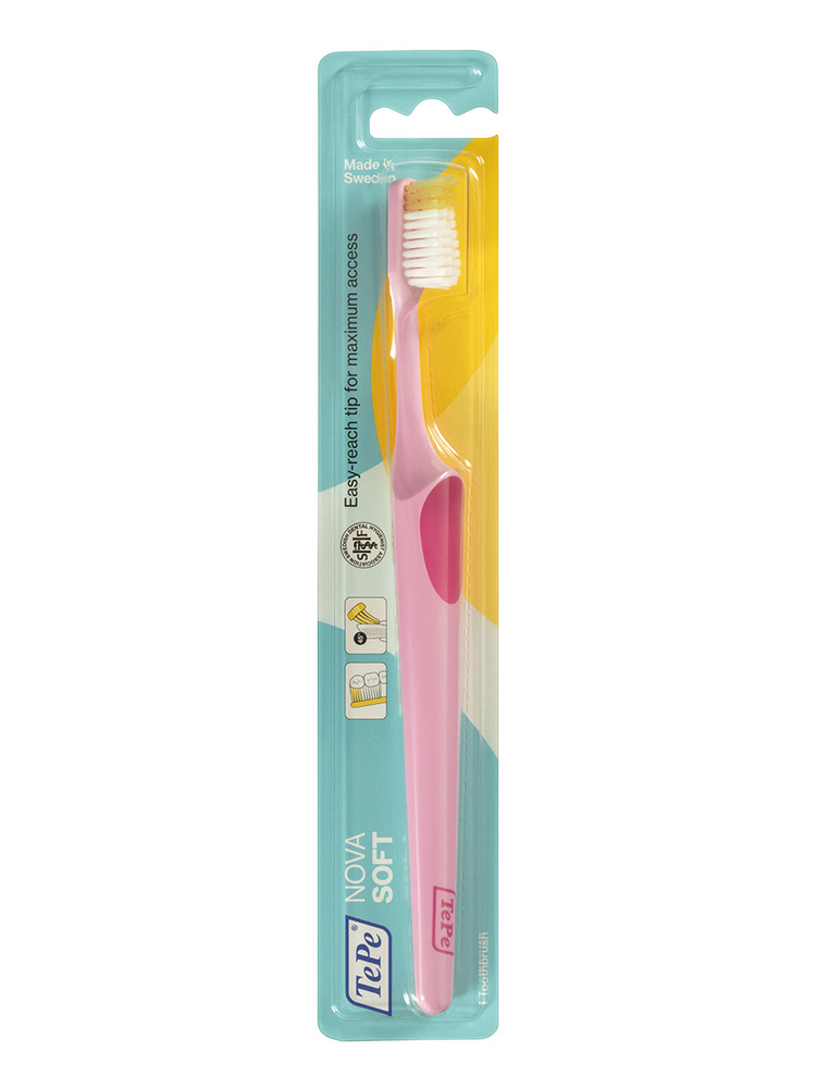 Специальная форма головки в сочетании с удлинёнными пучком на «носике» позволяет проникнуть в труднодоступные места, особенно вокруг жевательных зубов. Специальный силиконовый нескользящий упор для большого пальца на ручке: надёжный захват даже влажными и мыльными ладонями.TePe Nova можно отрегулировать так, чтобы она максимально соответствовала вашей анатомии. Для этого просто пальцами (аккуратно) наклоните головку под удобным для вас углом — щётка сохранит новую форму!